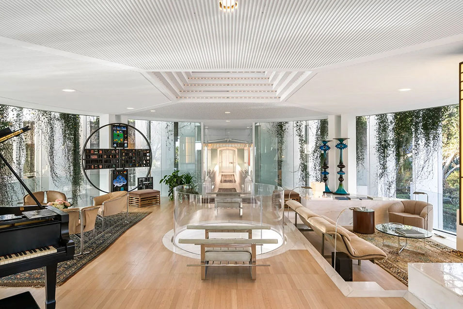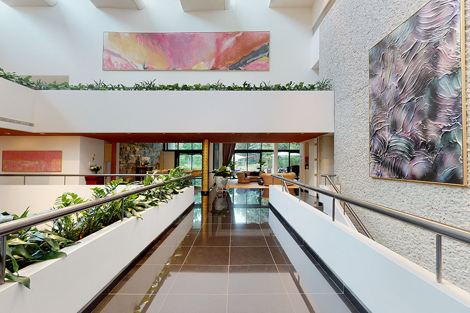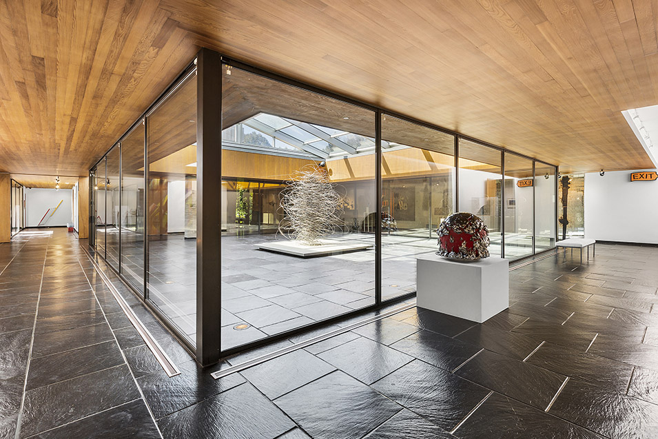 Lighting is also an important factor. On a six-acre estate currently on the market on Long Island’s North Shore, original architect Norman Jaffe created a postmodern glass-and-stone home in 1974 that blurs the lines between interior and exterior. With large, covered hallways surrounding a central skylit courtyard, it’s also filled with natural, non-direct sunlight, an ideal environment for protecting and viewing art. The home became the perfect gallery space for the impressive contemporary collection of sellers Jay and Jill Bernstein, who also installed museum-quality lighting to help exhibit their works by Chris Burden, Dan Flavin, Sol LeWitt, Yayoi Kusama, and more.